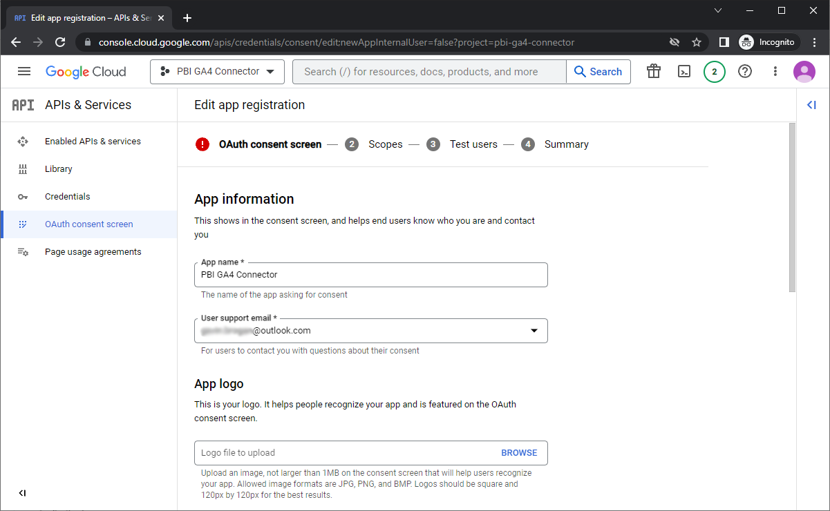- Give it an App name (same as the one you used before,’PBI GA4 Connector‘ is great) and a support email address to help your users.