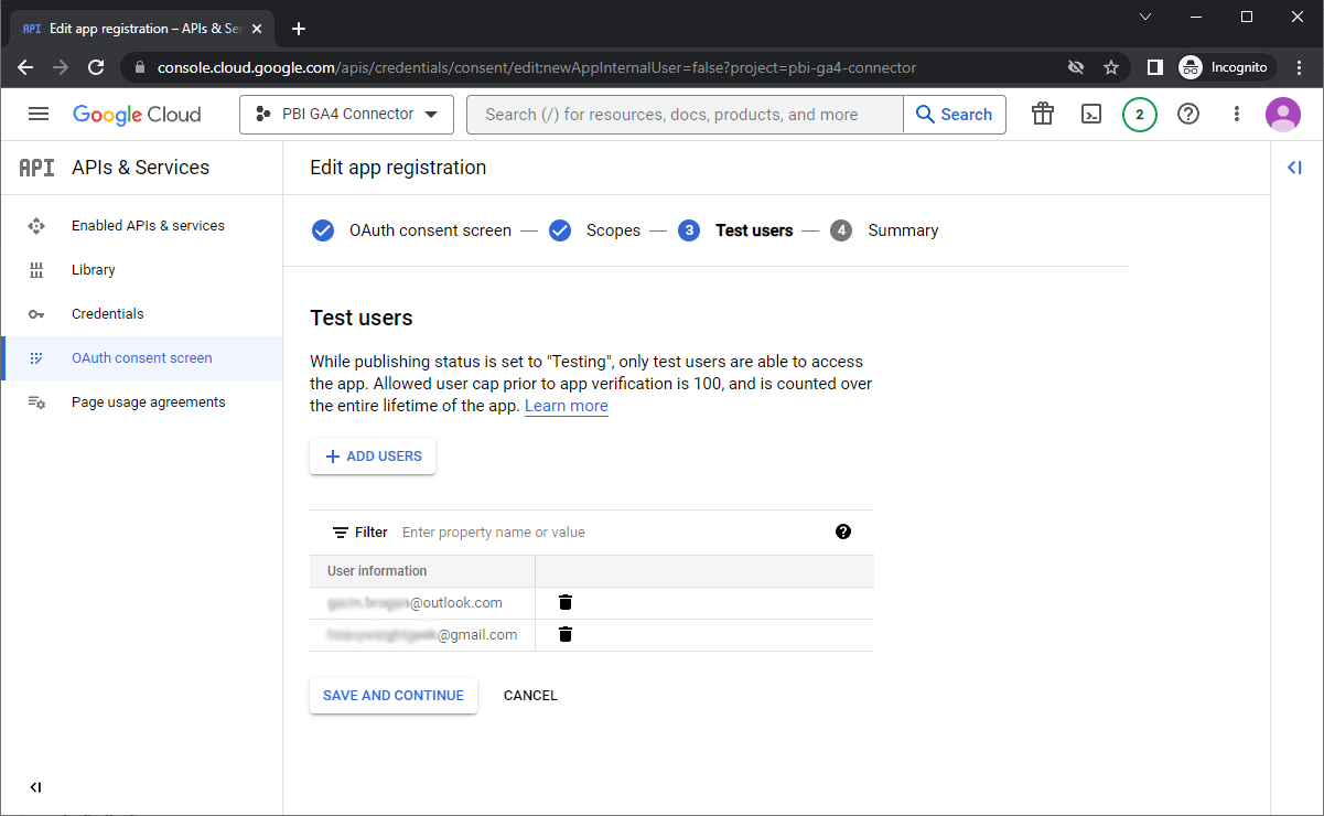 - Click ‘+ ADD USERS’, adding yourself and any testers, the ‘Save and Continue’.