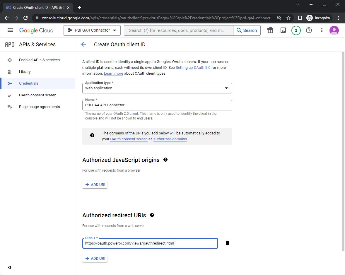 - Google needs to know once it’s logged you in to return back to Power BI, so copy in the URL ‘https://oauth.powerbi.com/views/oauthredirect.html‘, and hit ‘Create’.