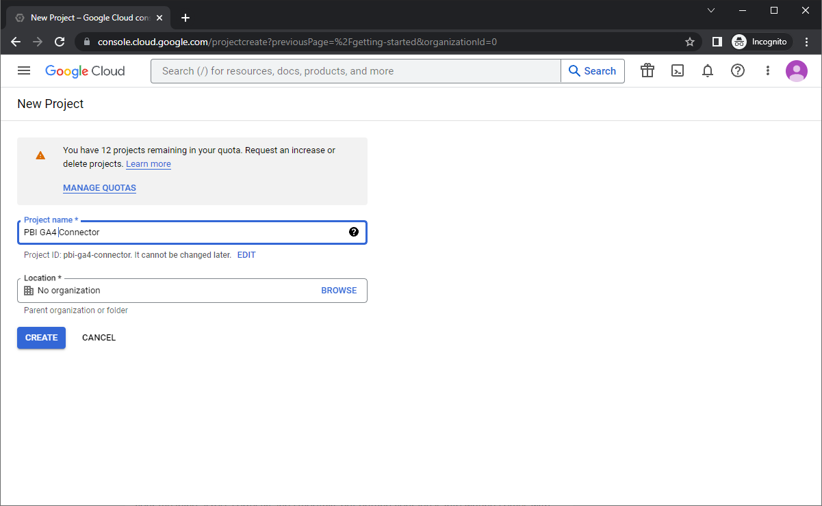 - Set the project name; thinking up a name to call your project is the hard bit. I went for ‘PBI GA4 Connector‘. Your welcome to use that too