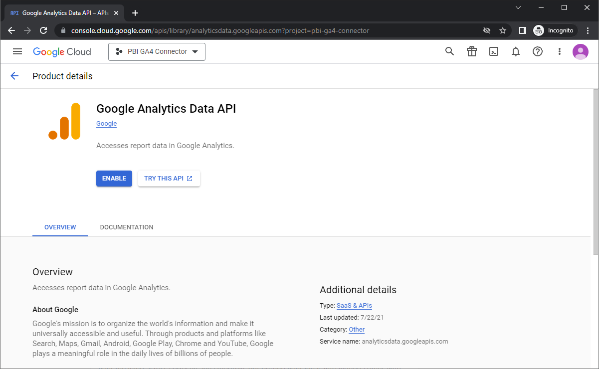 - Search for and select the ‘Google Analytics Data API‘