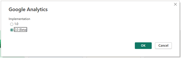 - PBI will prompt you with a version choice for which implementation of the link you’d like to utilize. Choose “2.0 (Beta)”.