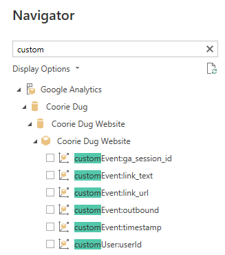 - Any custom dimensions you’ve created will appear in the navigator: under “customEvent” if they’re an event level dimension or “customUser” if they pertain to a user property.